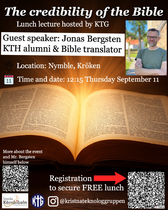 Torsdagen den 11 september är det en öppen lunch-föreläsning kl 12.15-13.00 på Kungliga Tekniska Högskolan (KTH) i Stockholm om Bibelns trovärdighet. Det är Kristna Teknologgruppen (KTG) som bjudit in Jonas Bergsten att berätta om Bibelns trovärdighet utifrån ett vetenskapligt perspektiv. Föreläsningen är på engelska.